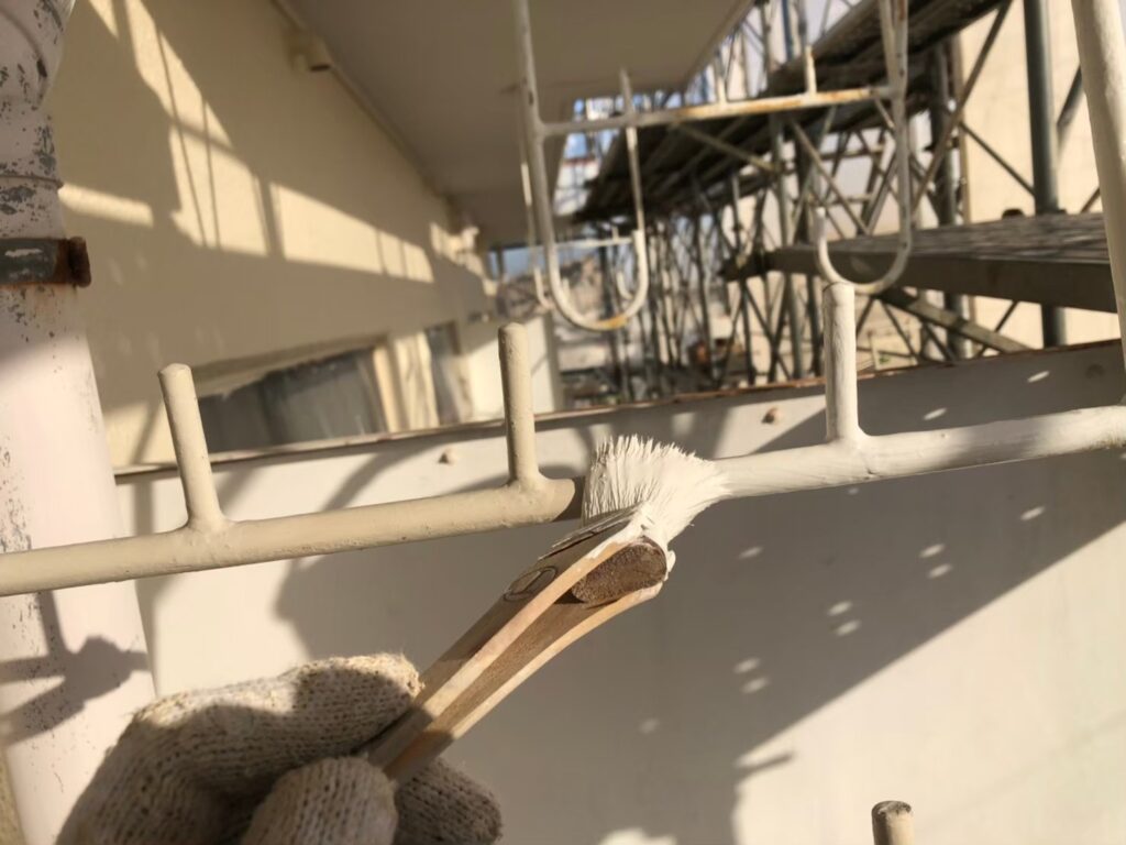 仕様材料(塗装) 雨樋、パーテーション:ケレン清掃 金具錆止め ウレタン塗装仕上げ  鉄部:ケレン清掃 ウレタン塗装仕上げ